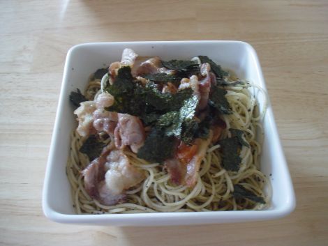 まずゲリィを茹でて、豚肉を梅肉と絡めて炒めて、ゲリィにシソを絡めてバター・にんにく等(その他調味料多数。)で炒めて、皿に盛って、味付け海苔をまぶして・・・